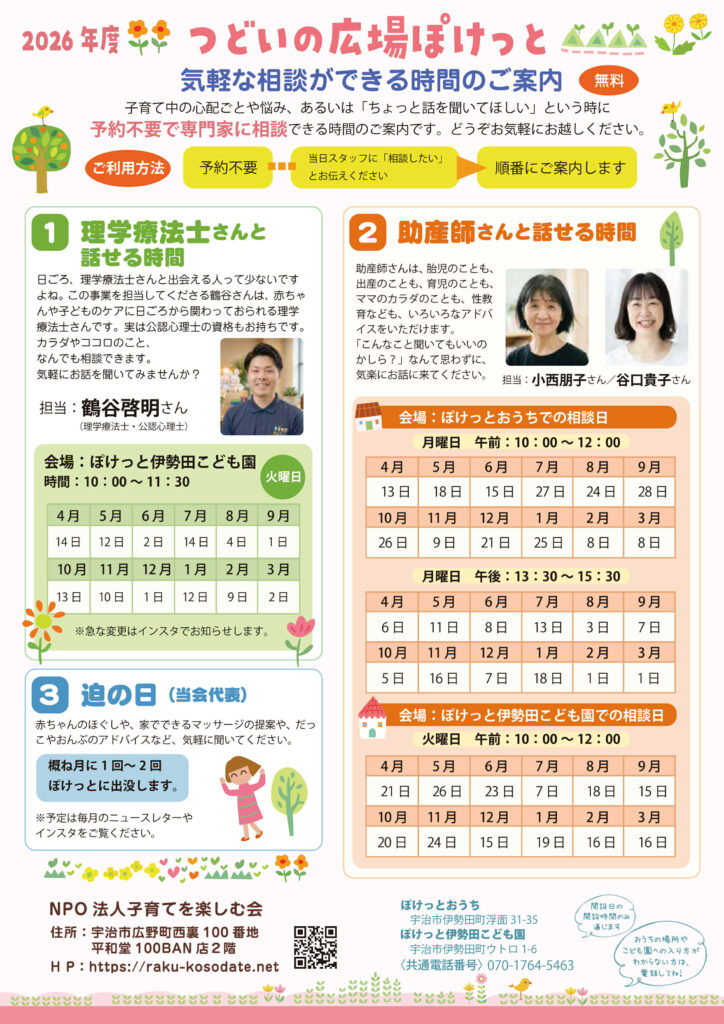 専用携帯:070-1764-5463 つどいの広場ぽけっとの開設日の10時~15時のみつながります。