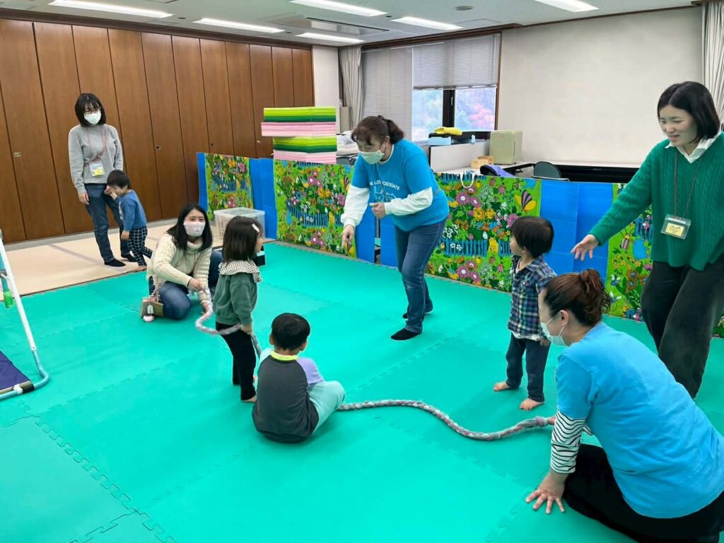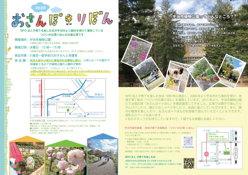 「つどいの広場りぼん」の出張広場として、週に一度、宇治市植物公園をお借りしてひろばをしています。研修室をひろば仕様にしてますが、この日は植物公園内も自由に楽しめます。車も入ってこないので、初めてのおさんぽには最適です。お部屋の中でゆっくり過ごすのもよし。思い思いの過ごし方をしてください。