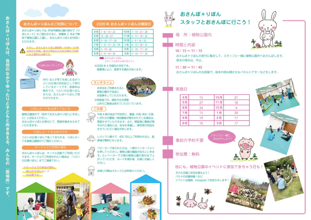 「おさんぽりぼん」の開催日で、この事業に参加をされる方は、お子様と保護者2名まで無料で植物公園にはいれます。ただし、開催時間のみとなります。(早めに入られたり、ゆっくりお過ごしの場合は、入場料が必要です)
