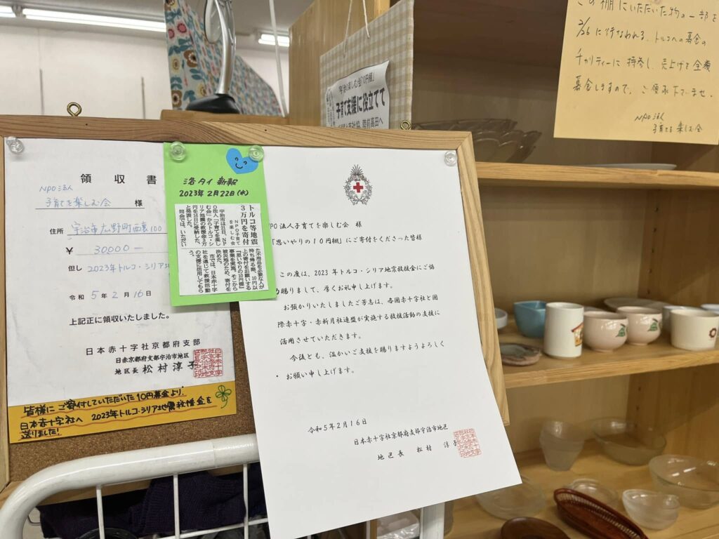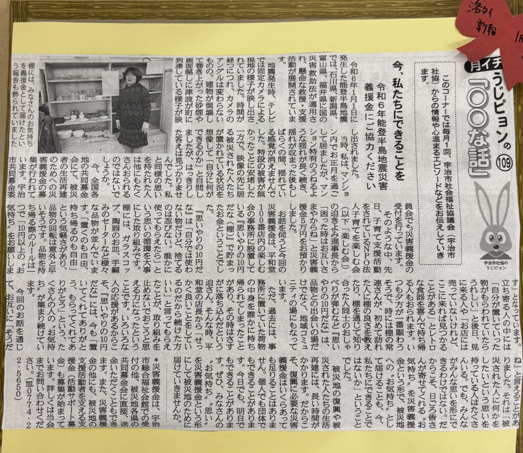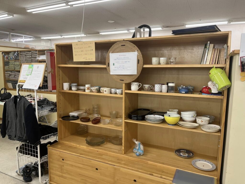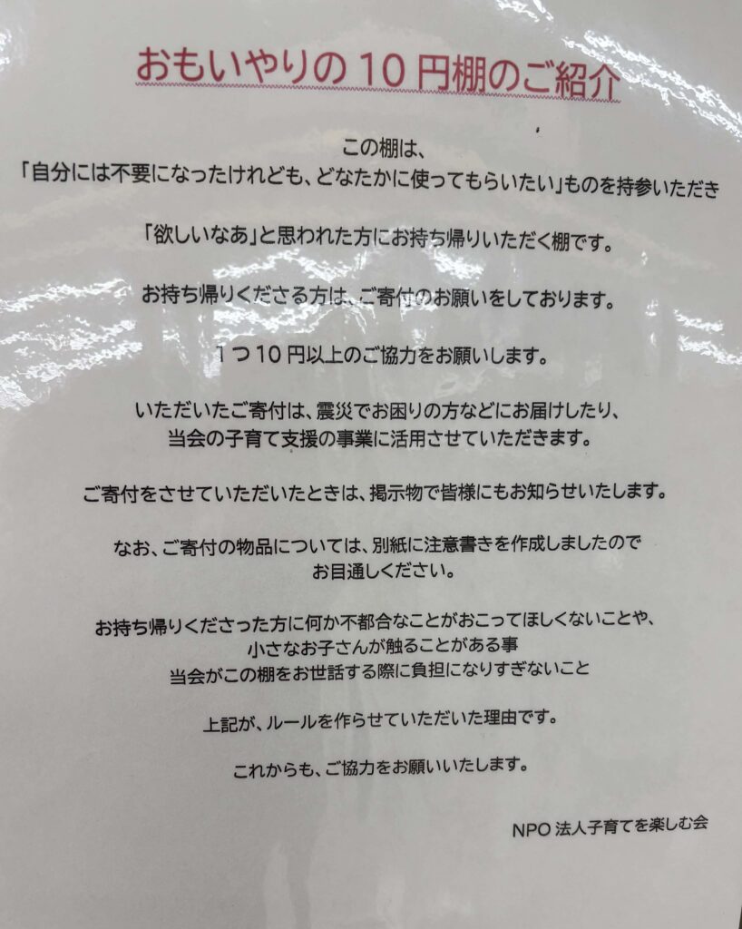 地域の方たちが「我が家ではいらなくなったもの」をお持ちくださり、「ほしい」という方がお持ち帰らる時に、ご寄付として「1つにつき、10円以上」を入れてくださる、思いやりの棚