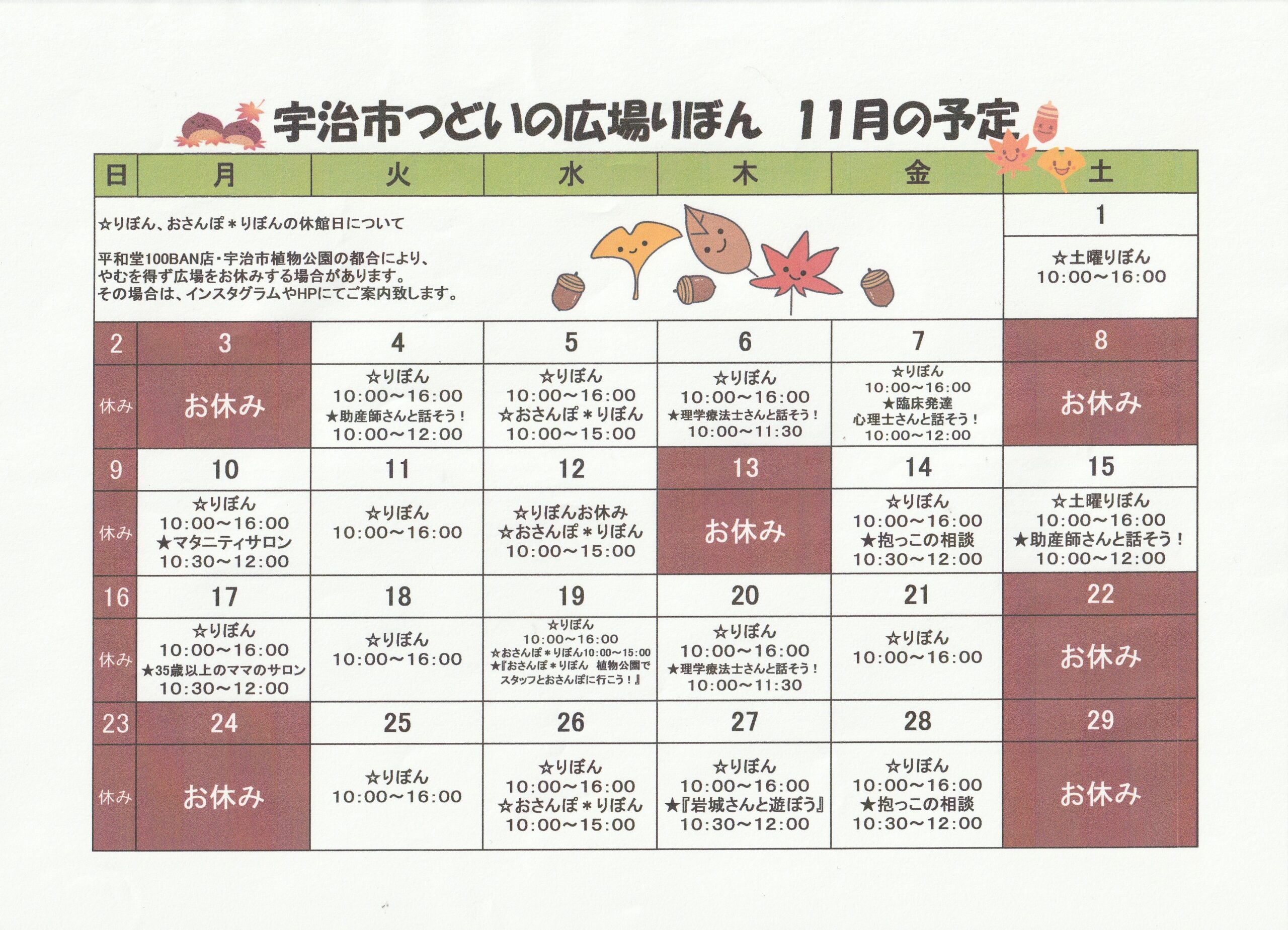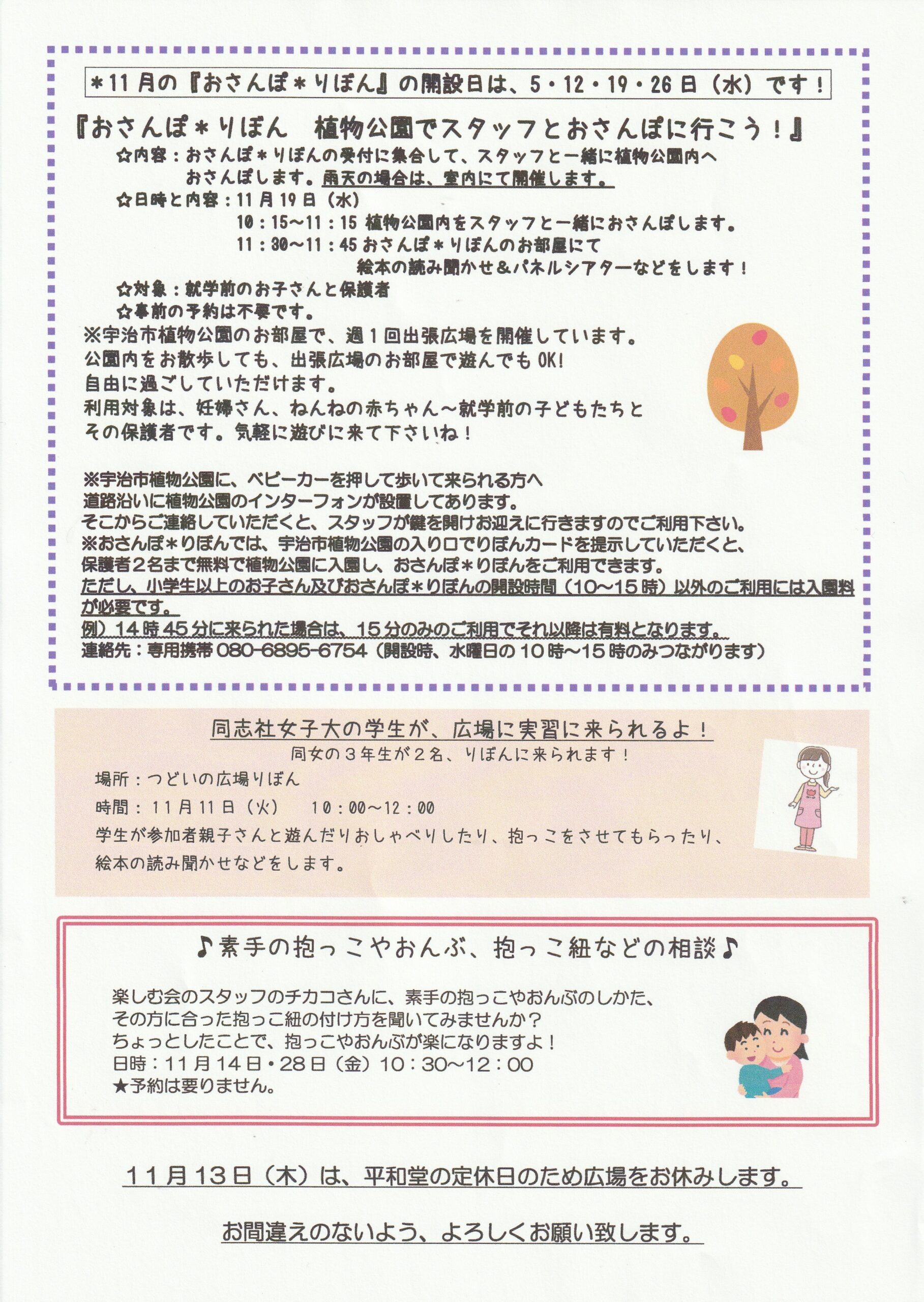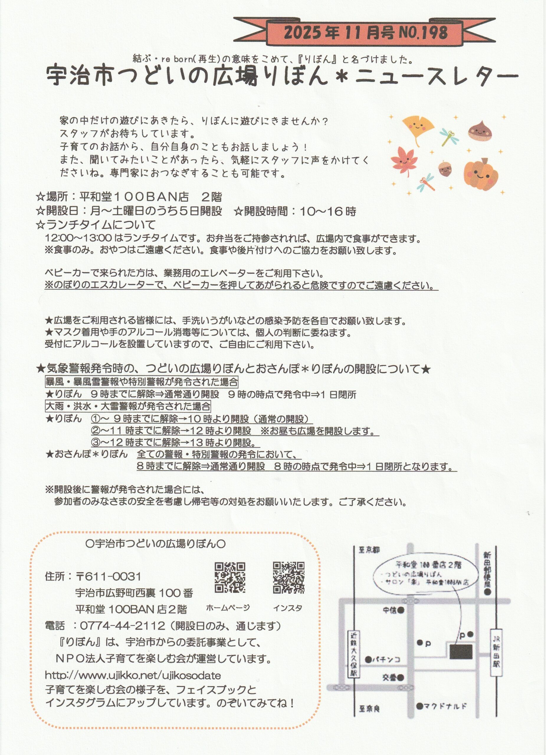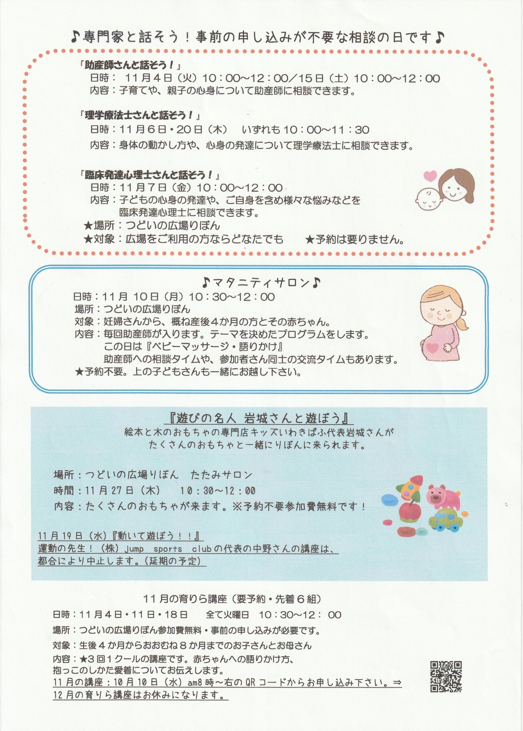 Home › 未分類 › つどいの広場りぼんニュースレター11月号 2025-11-01 つどいの広場りぼんニュースレター11月号 つどいの広場りぼんニュースレター11月号 11月号表紙 11月号① 11月号② 11月号カレンダー 関連記事 つどいの広場りぼんニュースレター11月号 つどいの広場りぼんニュースレター9月号 8月の『夏休み体験week』のご案内です! 『理学療法士と、お話できるサロン』4月実施へのお申し込みは⇓こちらから! つどいの広場りぼん・つどいの広場ぽけっと年末年始の開設のお知らせ つどいの広場りぼんニュースレター10月号