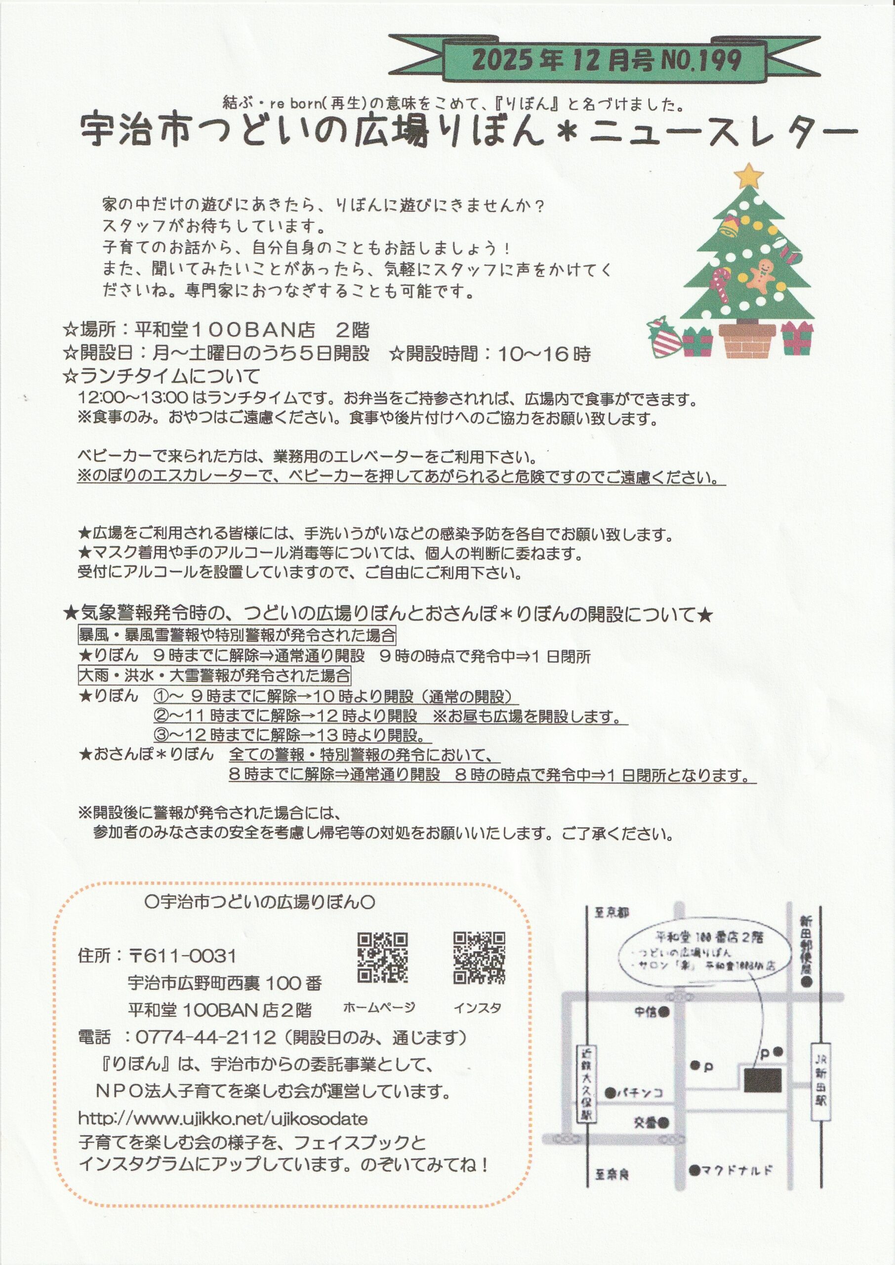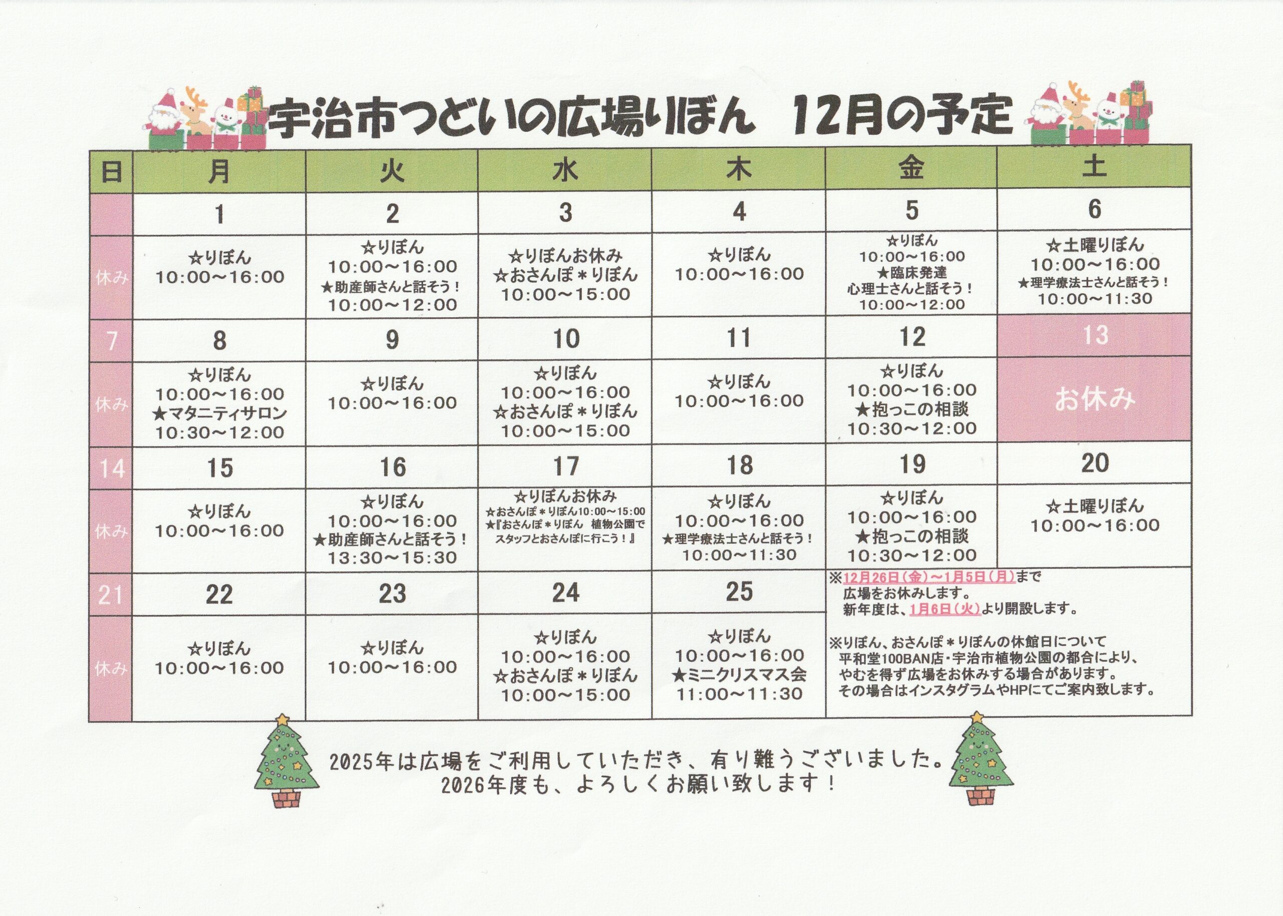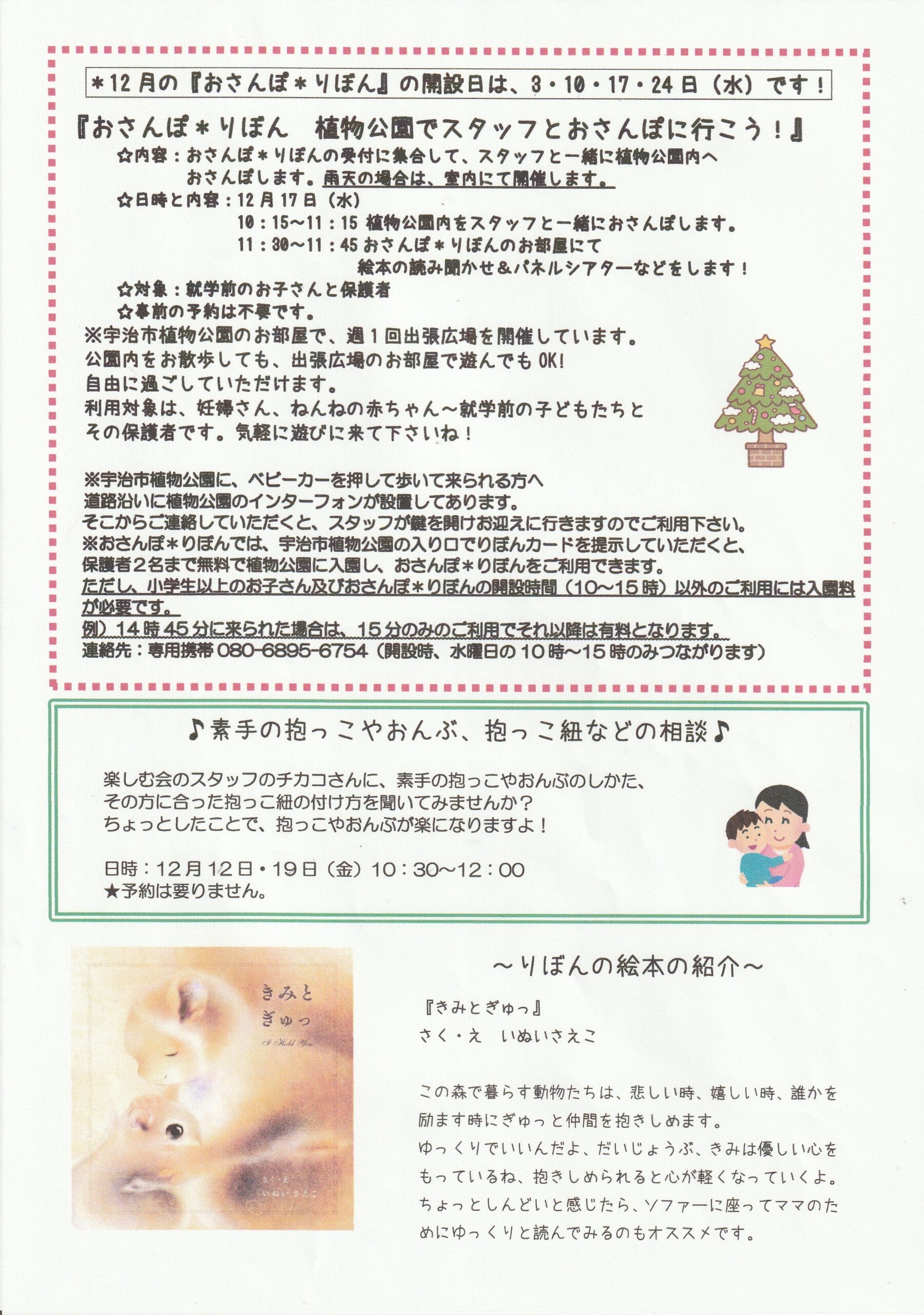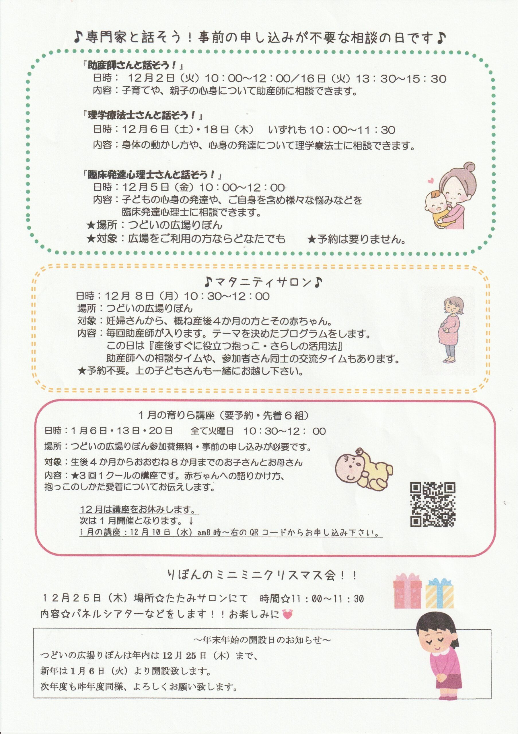 Home › 未分類 › つどいの広場りぼんニュースレター12月号 2025-11-26 つどいの広場りぼんニュースレター12月号 つどいの広場りぼんニュースレター12月号 12月号表紙 12月号① 12月号② 12月号カレンダー 関連記事 つどいの広場りぼんニュースレター7月号 新年度の各事業開催日のお知らせです つどいの広場りぼん 4月のカレンダーです つどいの広場りぼんニュースレター4月号 つどいの広場りぼんニュースレター9月号 つどいの広場りぼんニュースレター11月号
