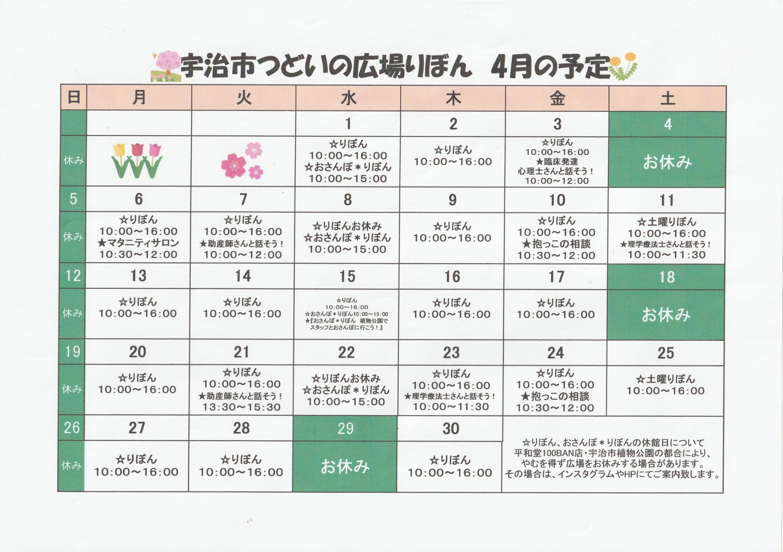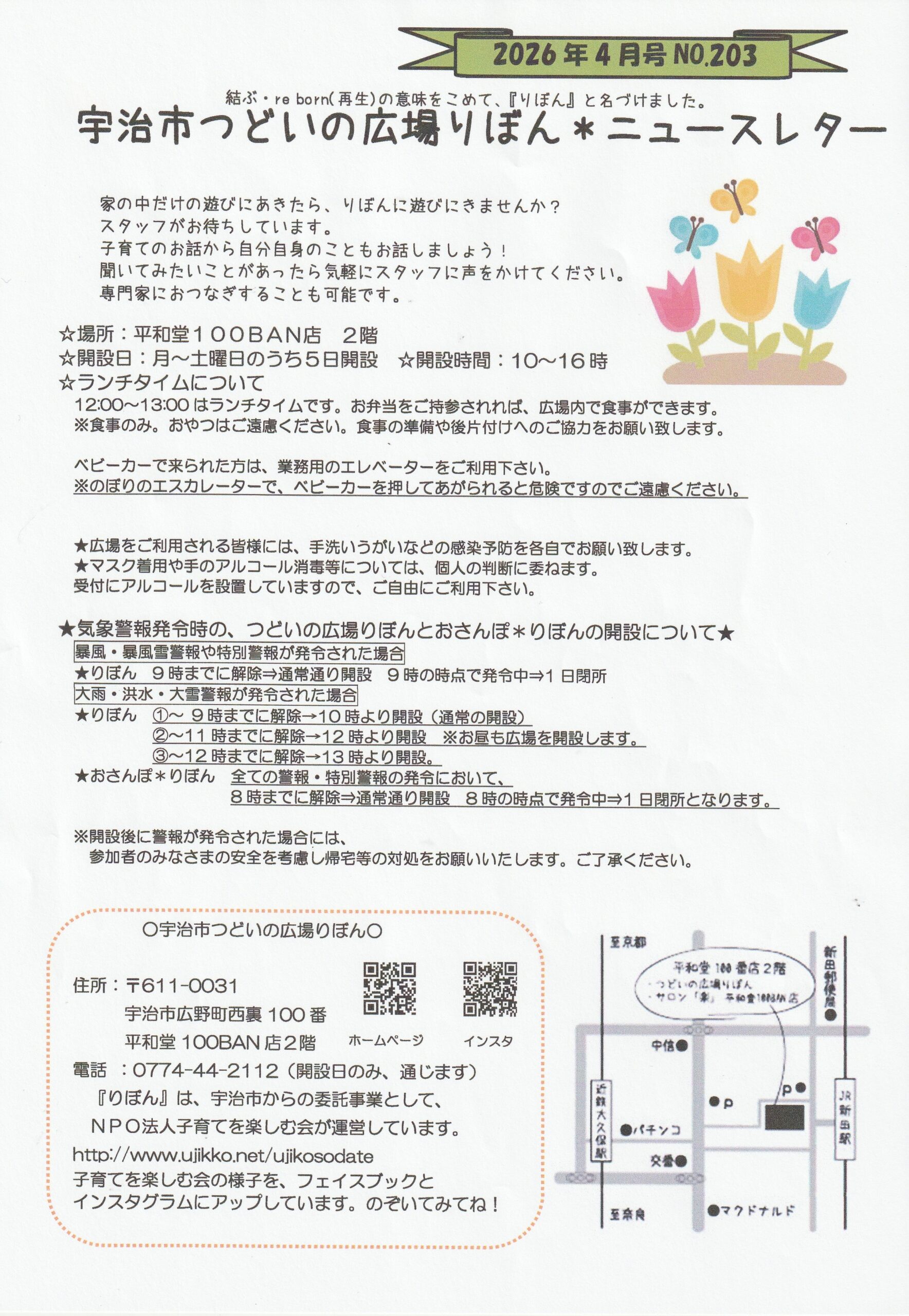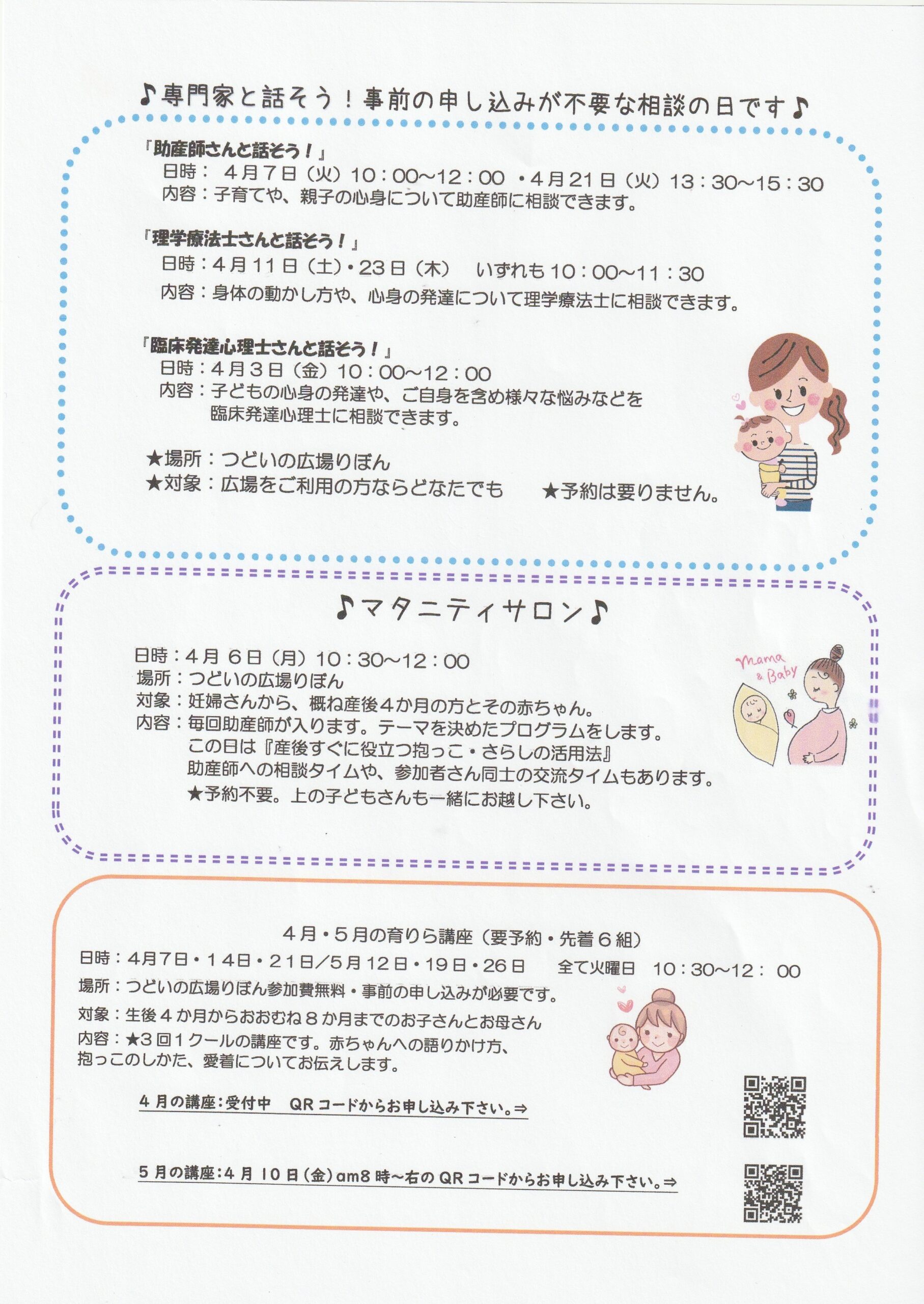 Home › 未分類 › つどいの広場りぼんニュースレター4月号 2026-03-17 つどいの広場りぼんニュースレター4月号 つどいの広場りぼんニュースレター4月号 4月号表紙 4月号① 4月号② 4月号カレンダー 関連記事 つどいの広場りぼんニュースレター9月号 つどいの広場りぼんニュースレター5月号 土曜りぼん・おさんぽ*りぼんの6月の開設について つどいの広場りぼん1月号ニュースレター 3月1日(火)『つどいの広場ぽけっと伊勢田こども園』開設場所・時間の変更のお知らせです つどいの広場りぼんニュースレター3月号